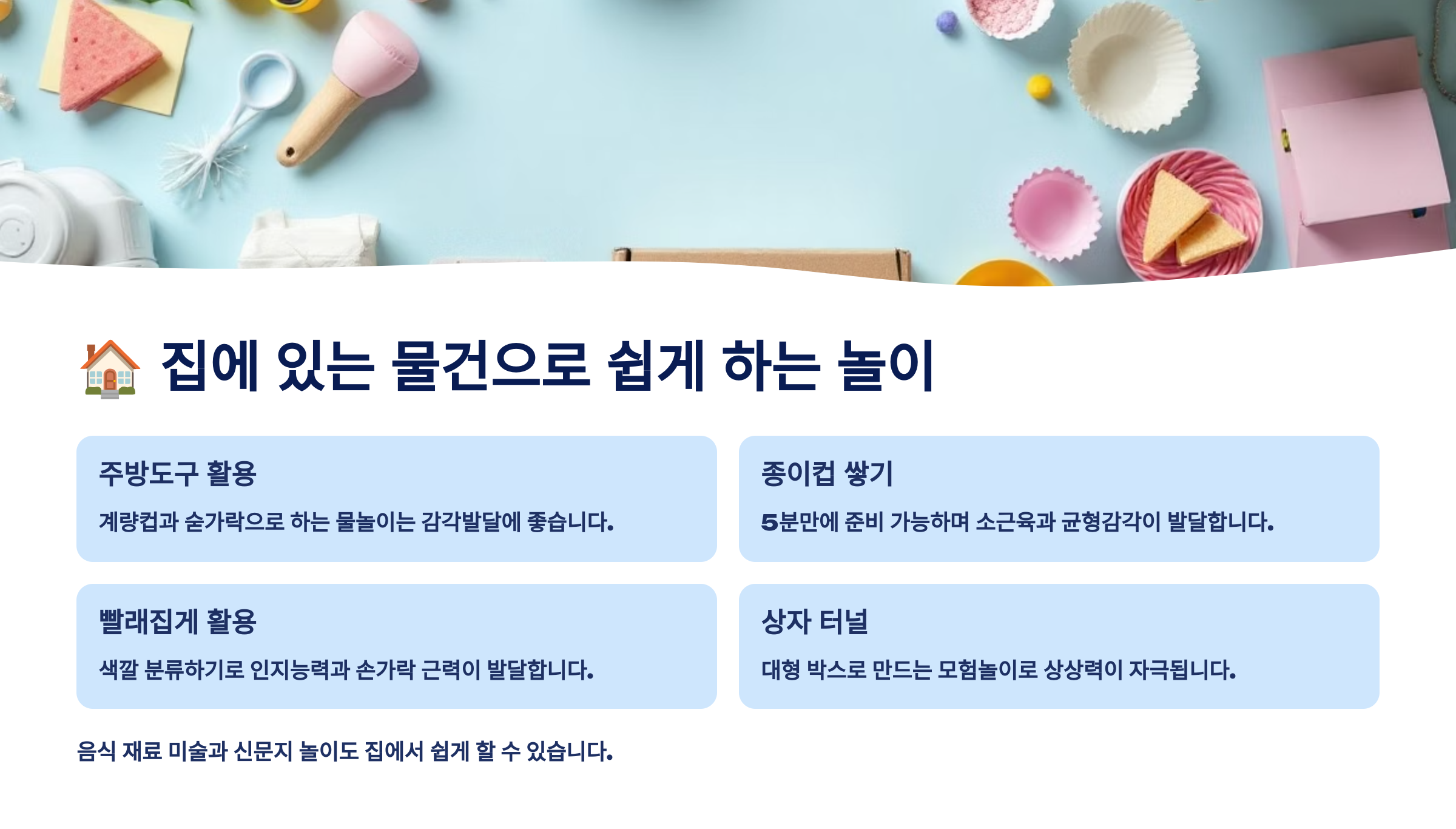 다음은 🏠 집에 있는 물건으로 쉽게 하는 놀이예요. 장난감 없이도 가능한 실전 놀이 아이디어 모아드릴게요!