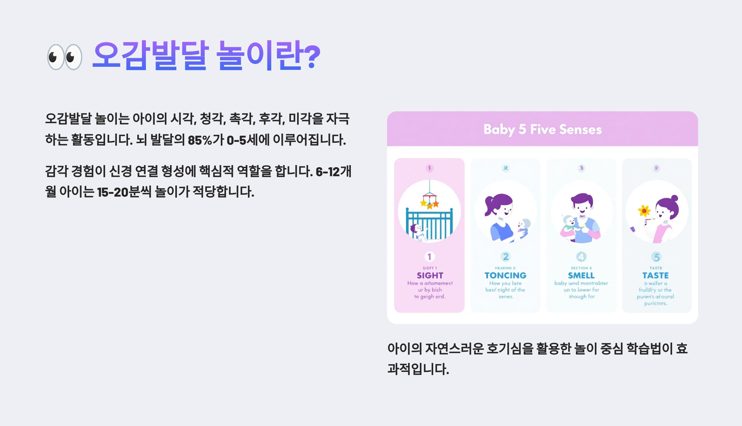 ‘오감’이란 시각, 청각, 촉각, 후각, 미각을 뜻해요. 아기나 유아는 이 다섯 가지 감각을 통해 세상을 처음 경험하게 돼요. 그래서 이 감각을 자극해주는 놀이는 단순히 재미있는 활동이 아니라, 두뇌 발달과 정서 안정, 사회성까지 키워주는 교육의 일부예요. 🧠