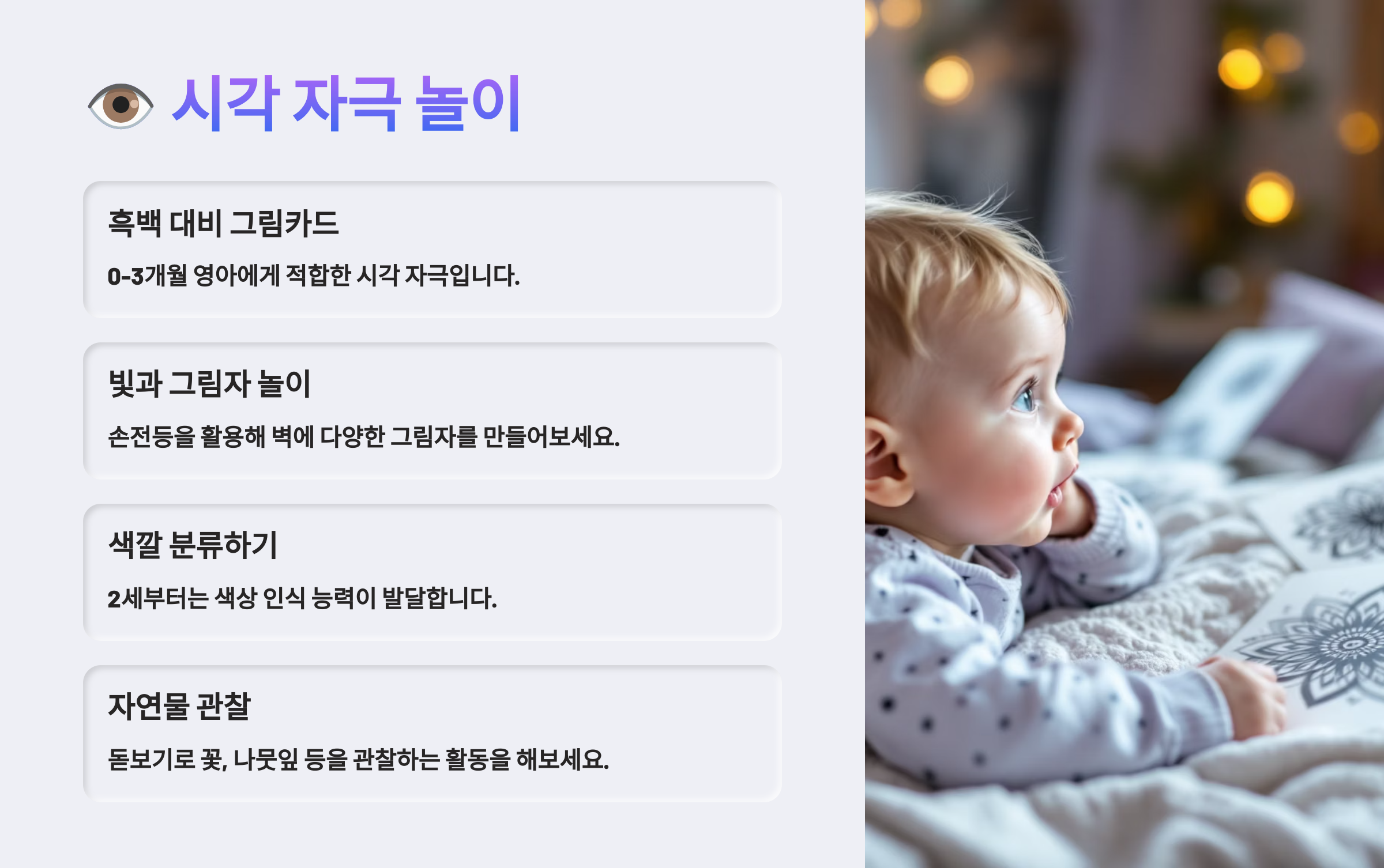 | 시각 | 색깔 카드, 빛 그림자 놀이 | 집중력, 색 인지 발달 |