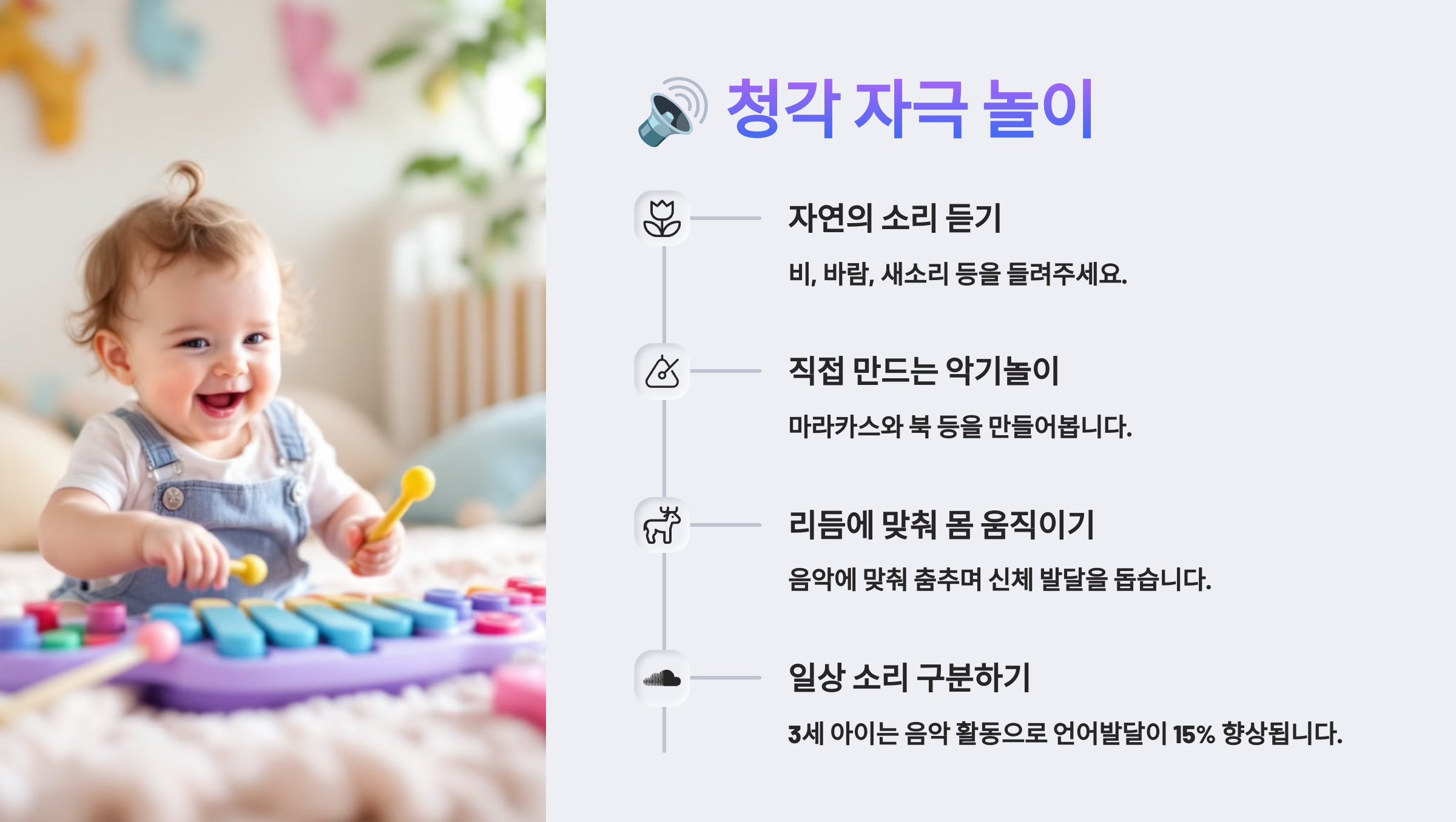 이처럼 아이들은 다양한 소리를 들으면서 언어 발달, 리듬감, 집중력을 키우게 돼요. 따라서 소리의 크기, 높낮이, 리듬 등을 다양하게 경험할 수 있게 해주는 것이 좋아요. 🎶