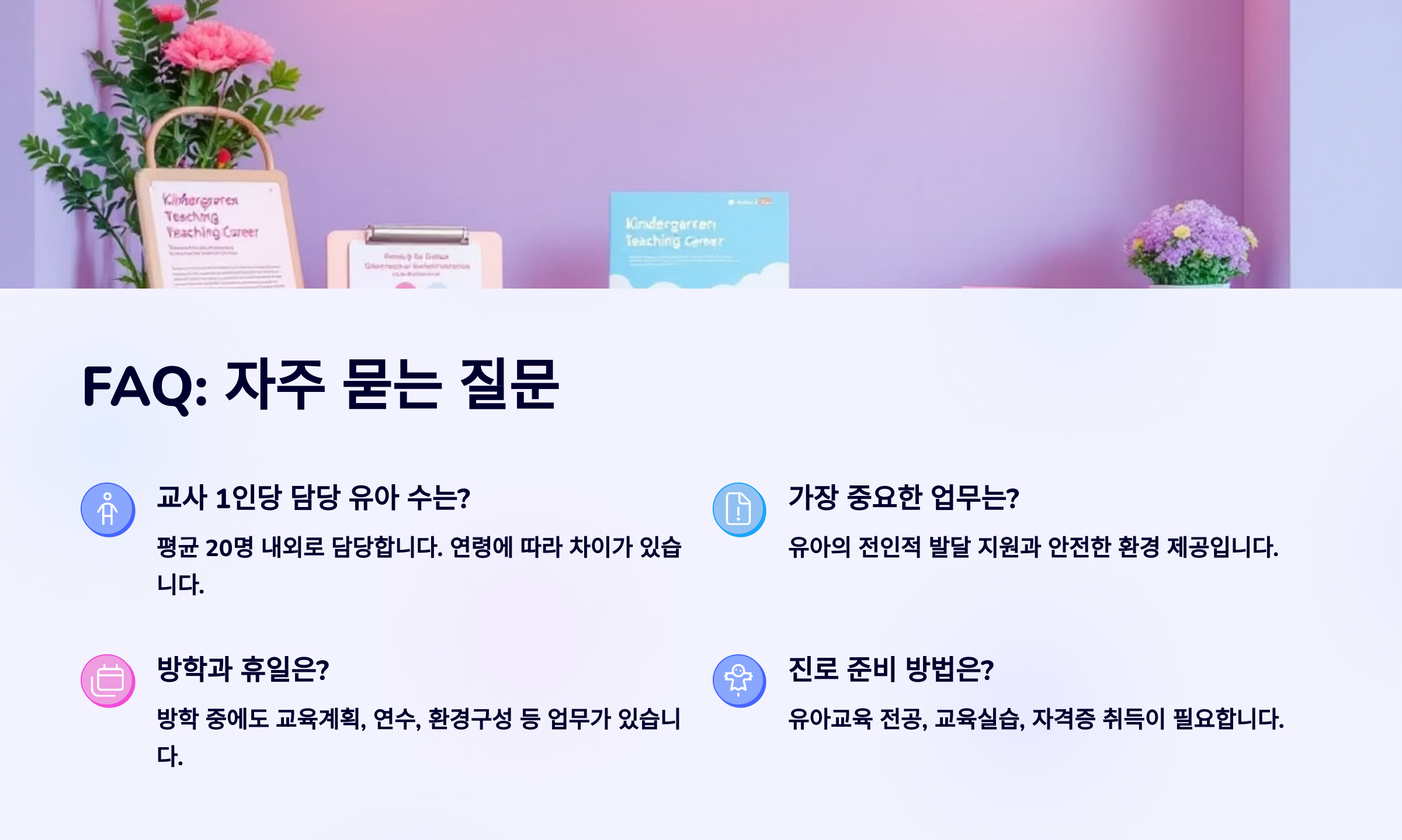 ❓ 이제 유치원 교사에 대해 자주 묻는 질문들을 모은 FAQ 섹션으로 넘어가자! 현실적인 궁금증, 전부 풀어줄게! 😊