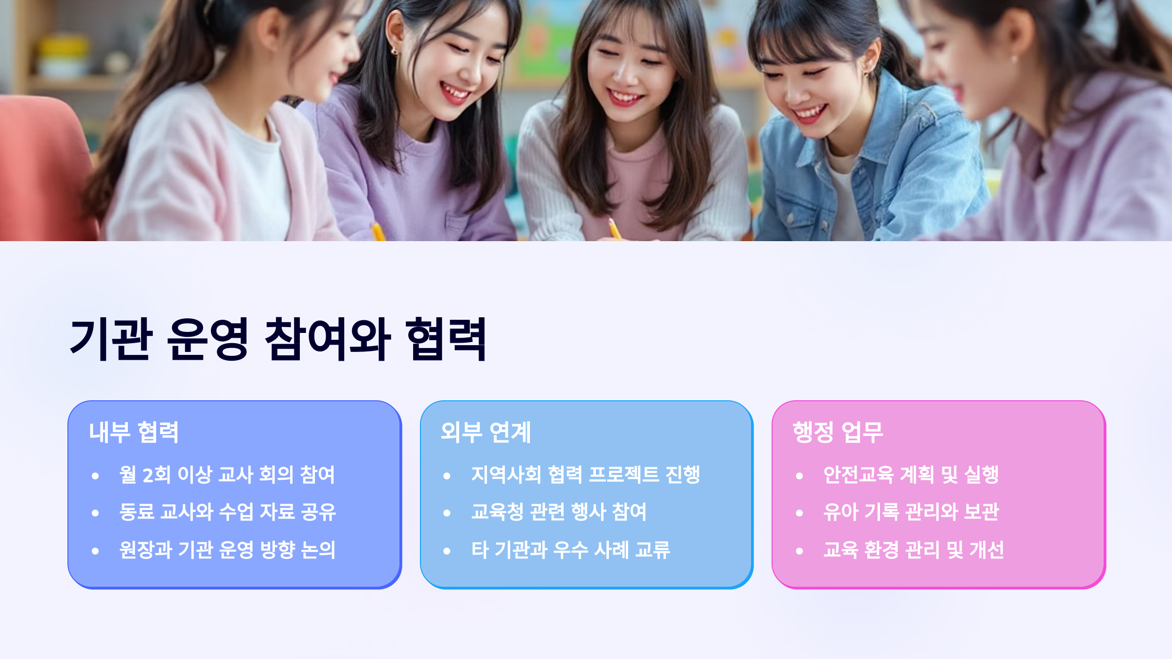 🏫 이제 다음은 교육 외에도 중요한 일! 기관 운영 참여와 협력에 대해 이야기해볼게! 교사들의 '보이지 않는 노력'이 가득 담긴 이야기야! 😊