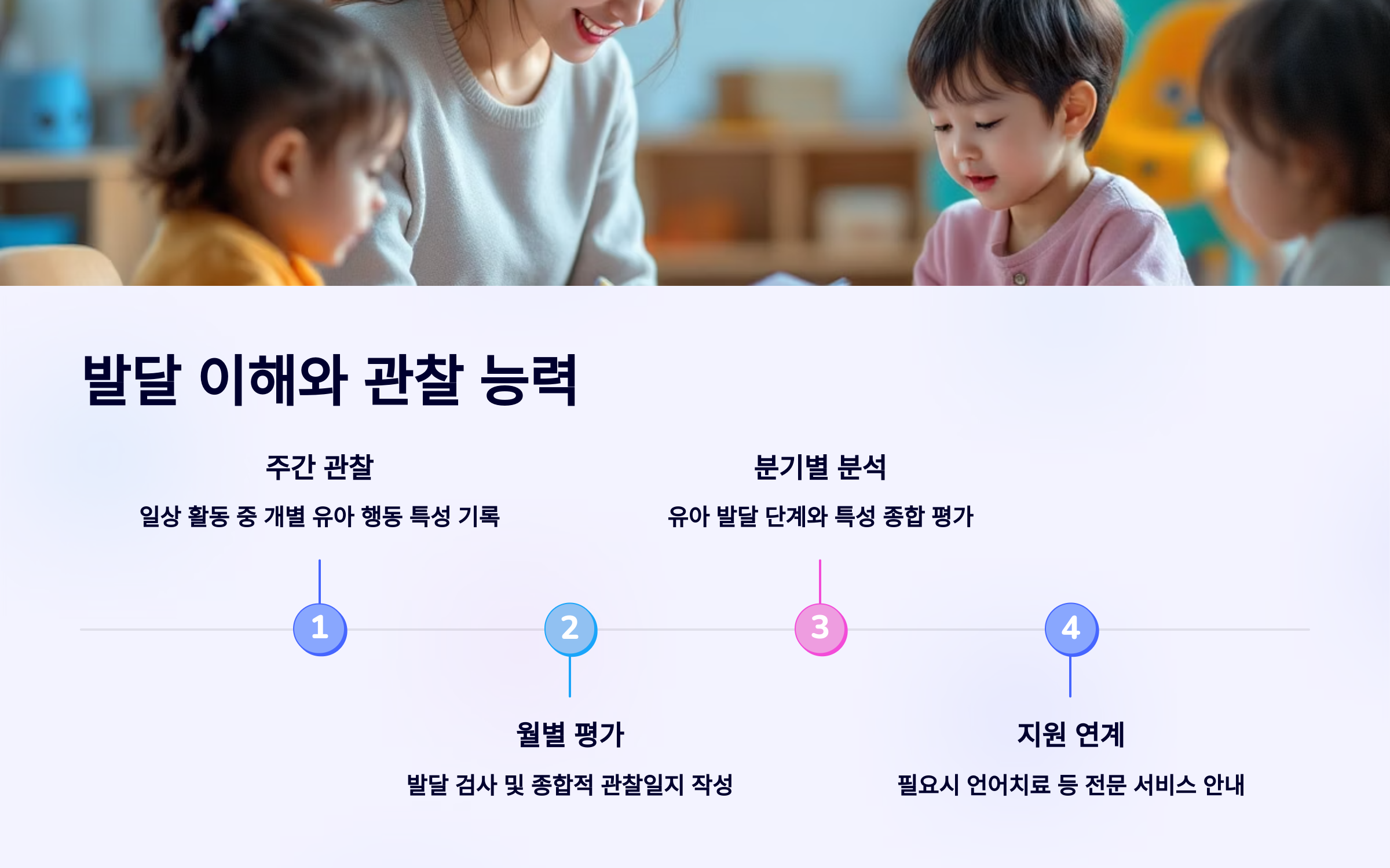 💬 교사는 학부모에게 발달 상황을 설명할 때도 전문적인 언어를 사용해요. "또래보다 언어 표현력이 높고, 문제 해결력이 뛰어나요", "소근육 협응 발달이 조금 더디지만 좋아지고 있어요"처럼요. 이게 바로 관찰 + 발달 이해의 결합이죠.