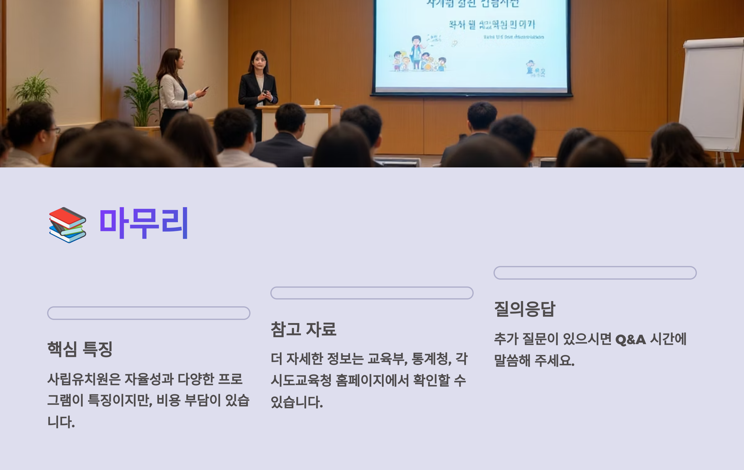 오늘은 사립유치원의 특징부터 공립과의 차이, 운영 프로그램, 비용, 법률 규제까지 아주 꼼꼼하게 살펴봤어요.