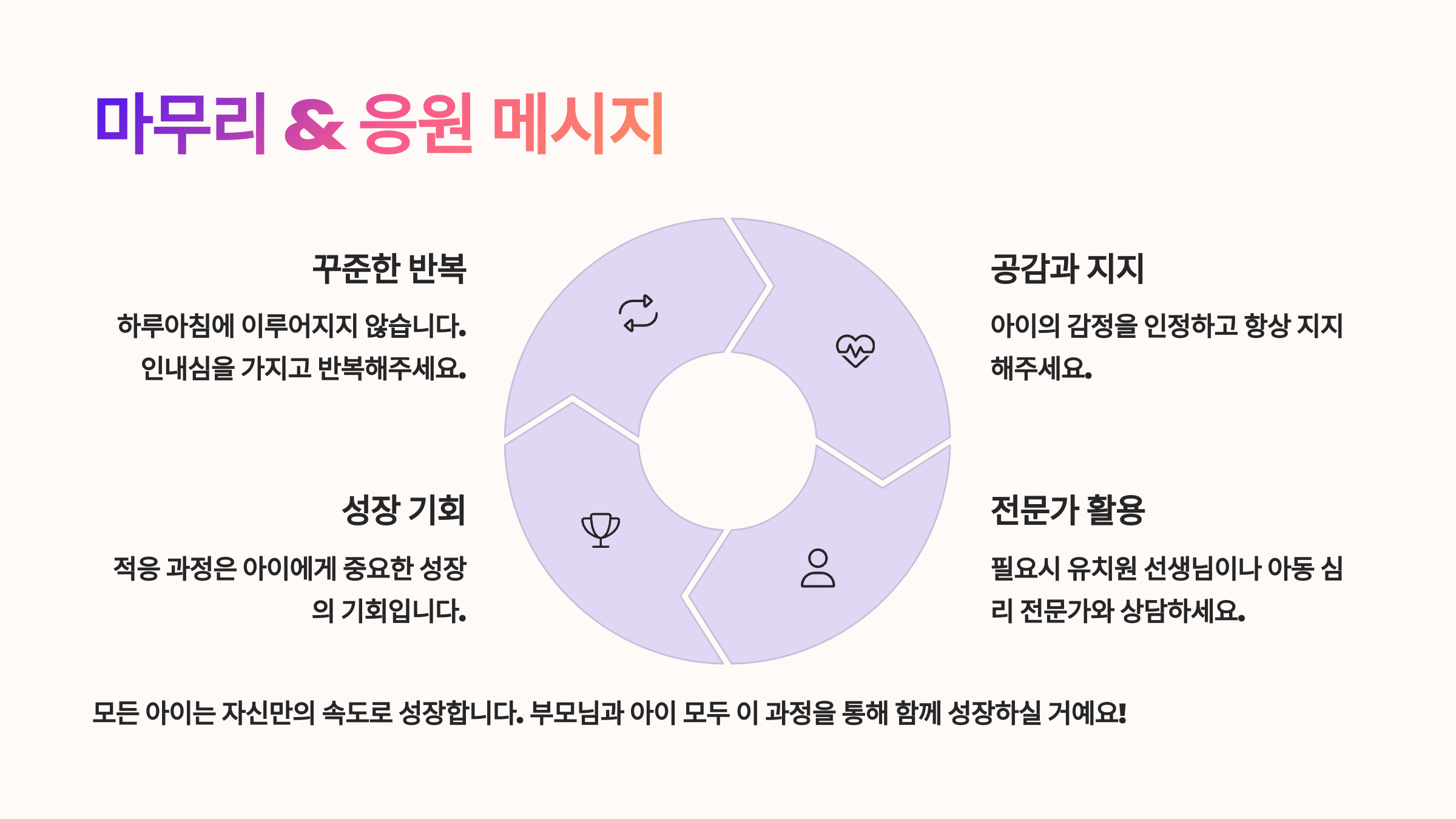 지금의 유치원 적응훈련이, 훗날 아이가 세상을 더 자신 있게 마주할 수 있는 기반이 된다는 걸 기억해주세요.