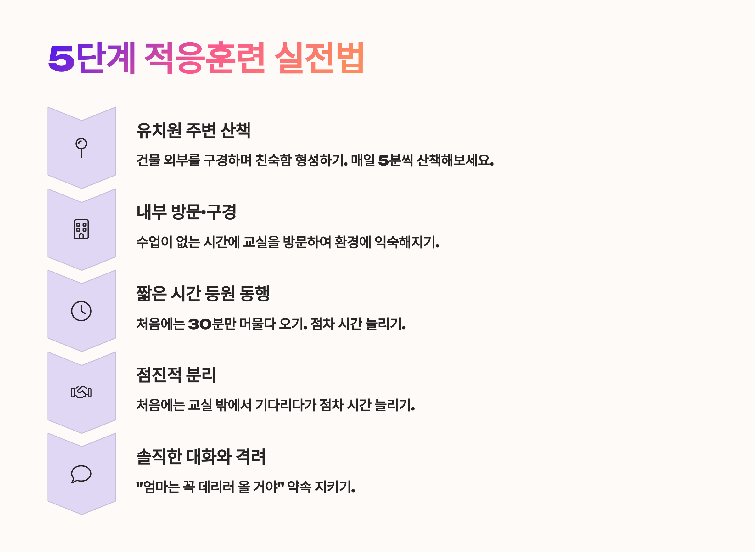 🚦 유치원 적응훈련을 잘하기 위해선 체계적인 단계별 접근이 필요해요. 갑자기 "내일부터 유치원이야!" 하고 시작하면 아이는 당황할 수밖에 없어요. 그래서 5단계로 천천히 적응시키는 방법이 효과적이에요. 아래에 하나씩 소개할게요! 😊