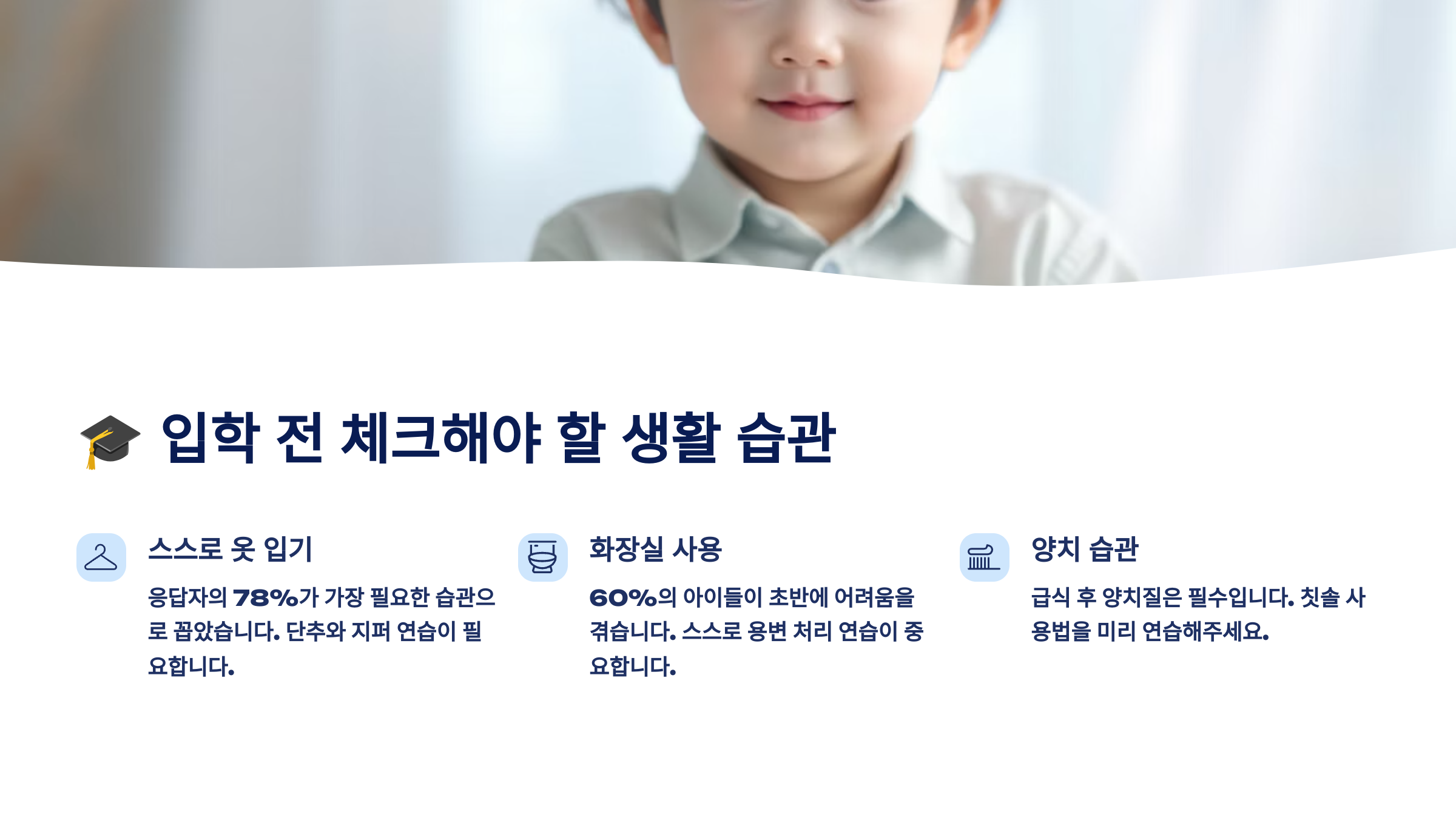이런 생활 습관은 한꺼번에 가르치려면 아이도 부모도 힘들어요. 입학 1~2달 전부터 조금씩 놀이처럼 연습하면 훨씬 자연스럽게 익힐 수 있어요. 무엇보다 아이가 실수했을 때 혼내기보다 스스로 깨달을 수 있도록 도와주는 게 중요해요. 💕