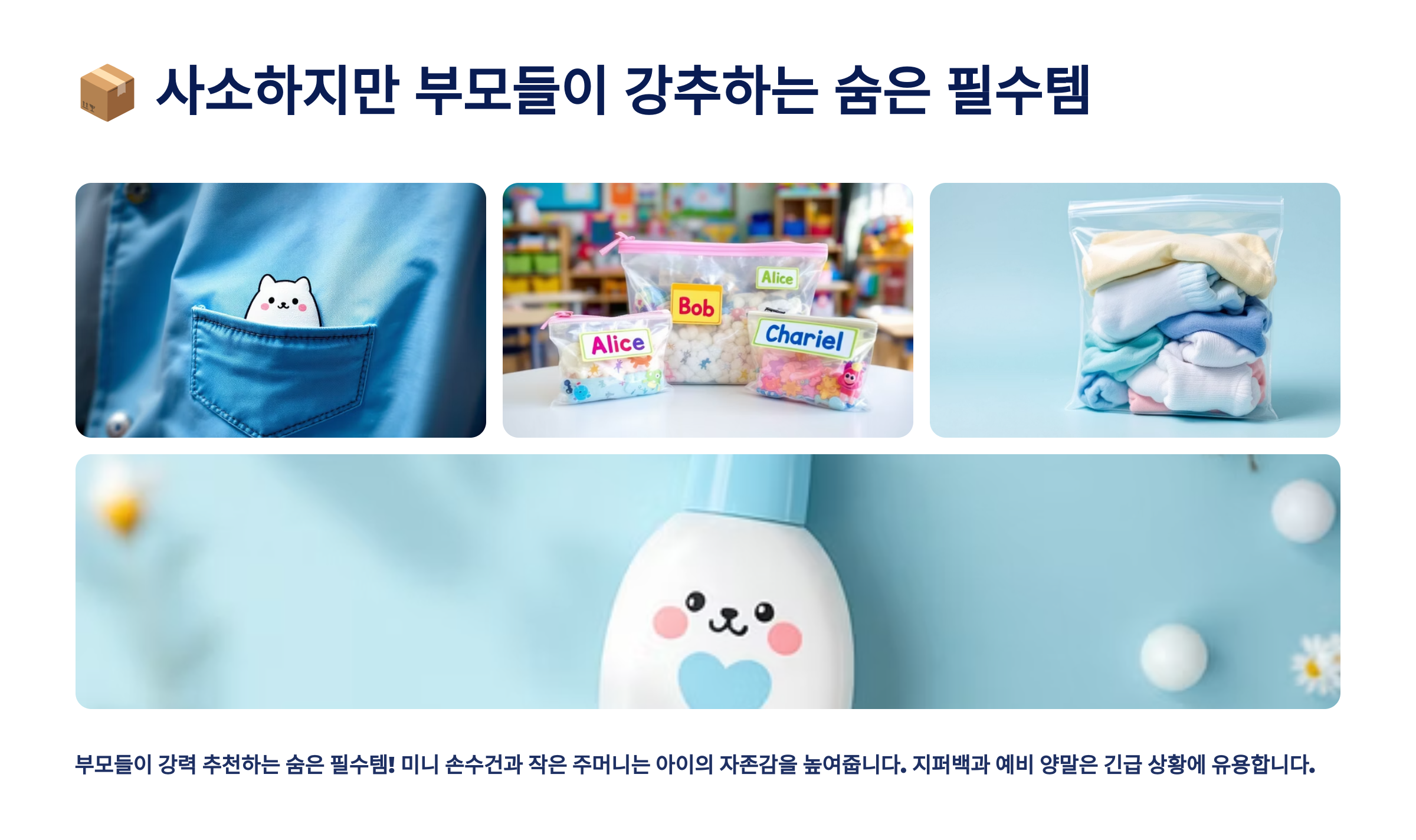 준비물 TOP10은 다 챙겼는데도, 현장에서는 "이런 게 더 필요했어요!" 하는 경우 많아요. 부모님들이 실제로 겪은 후 추가 구매한 소소하지만 유용한 아이템들 지금부터 소개할게요! 😊