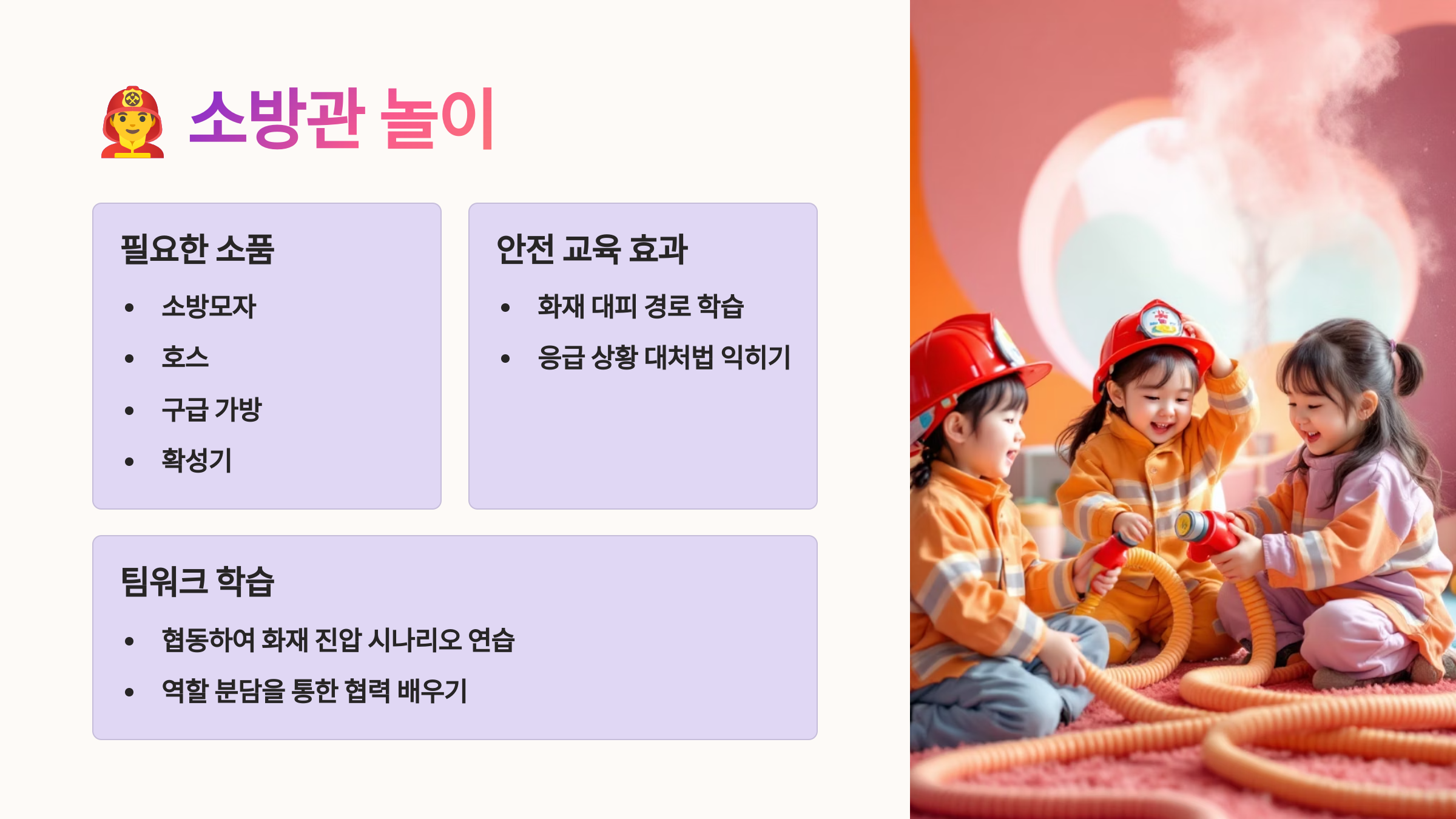 다음은 용기와 책임감의 상징인 소방관 놀이를 소개할게요! 🔥🚒