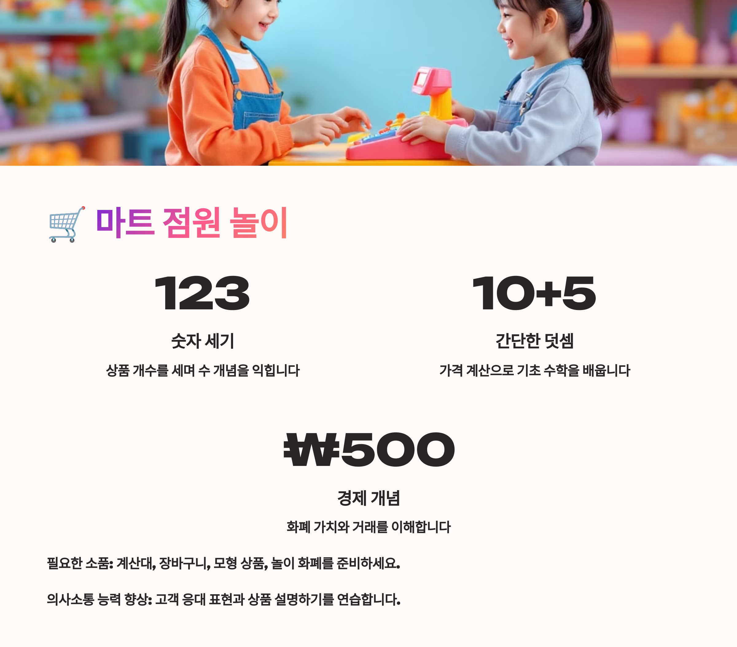 마트 점원 놀이는 수 개념, 사회성, 의사소통 능력까지 한 번에 키워줄 수 있는 현실 밀착형 역할놀이예요. 아이들이 평소 자주 보는 공간이라서 상황 몰입도도 정말 높아요! 🛒