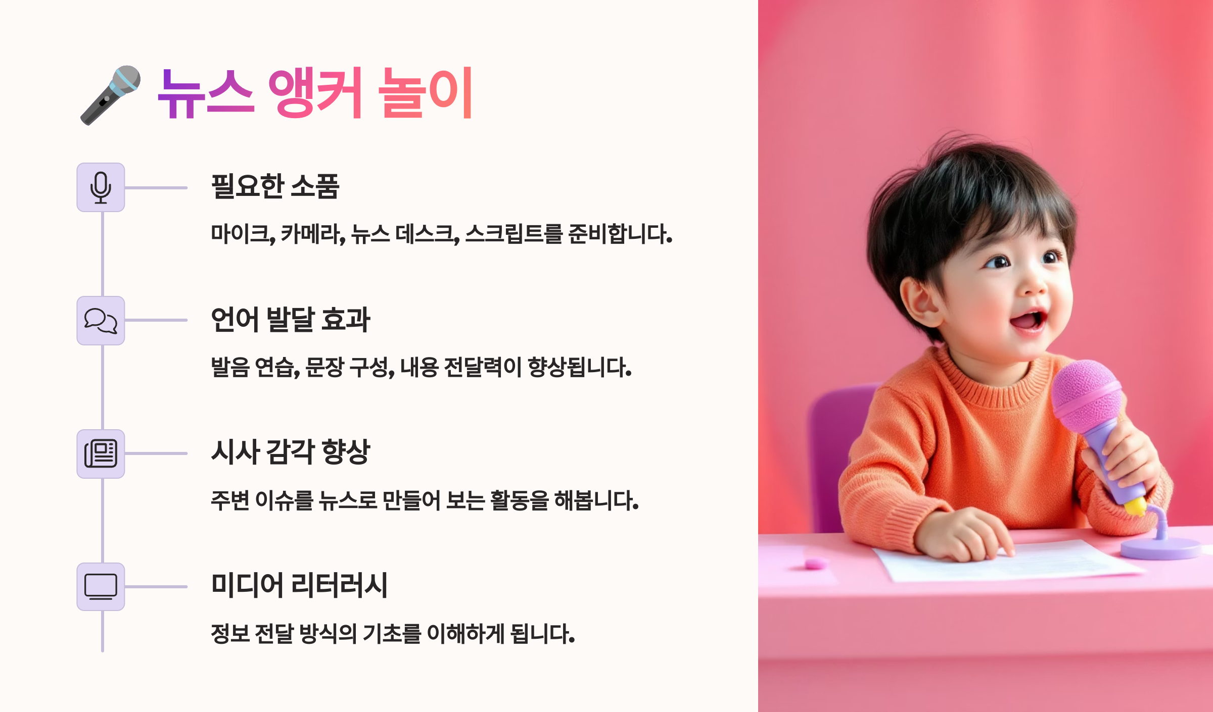 뉴스 앵커 놀이는 아이가 말하는 힘을 키우고, 정보를 정리하고 전달하는 능력을 키워줄 수 있는 언어 집중형 역할놀이예요. 마이크 하나만 있어도 금세 뉴스 스튜디오가 탄생하죠! 🎙️