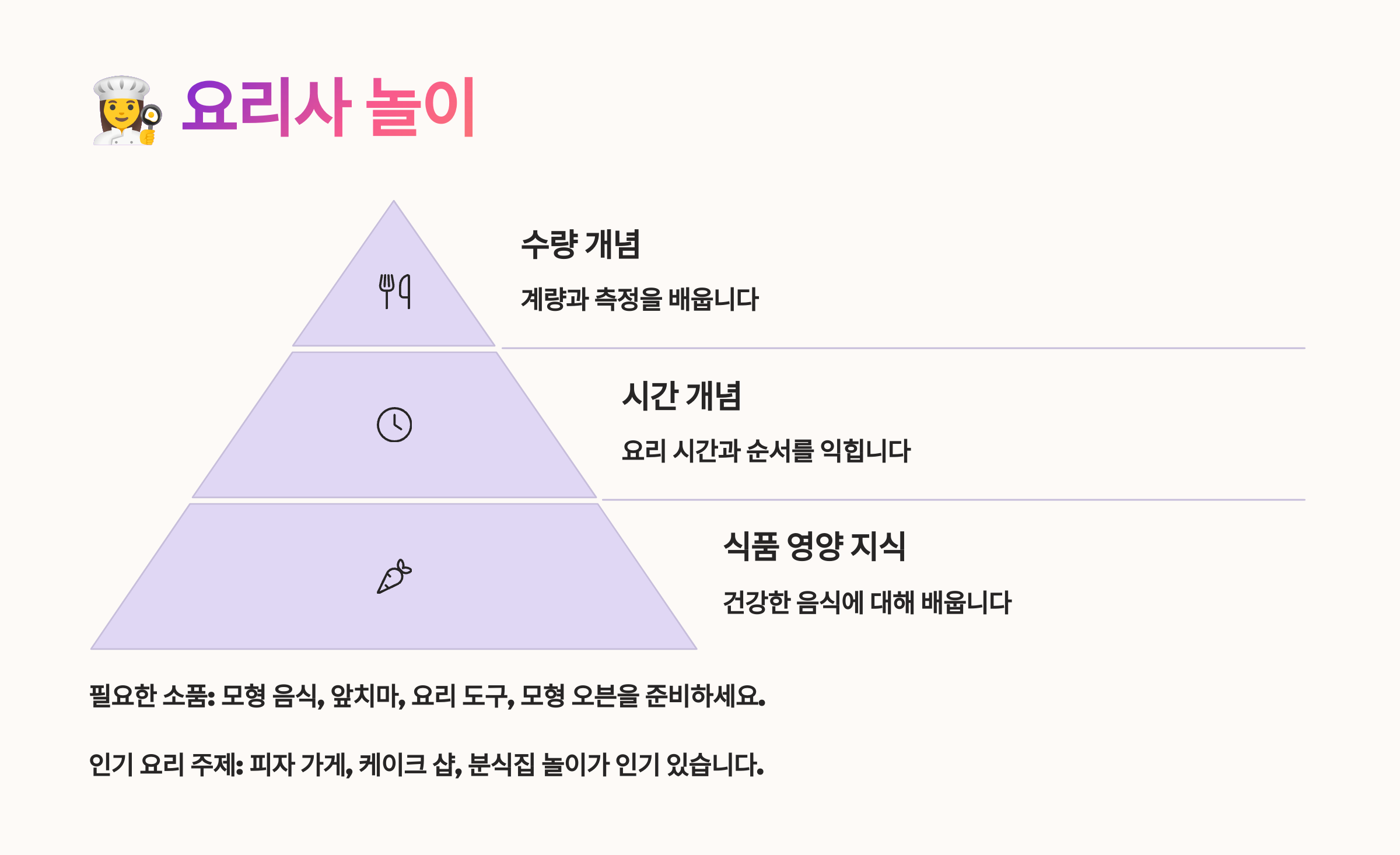 | 창의력 | 상황 설정, 역할 구성 능력 향상 | 요리사 놀이, 공룡 세계 놀이 |
