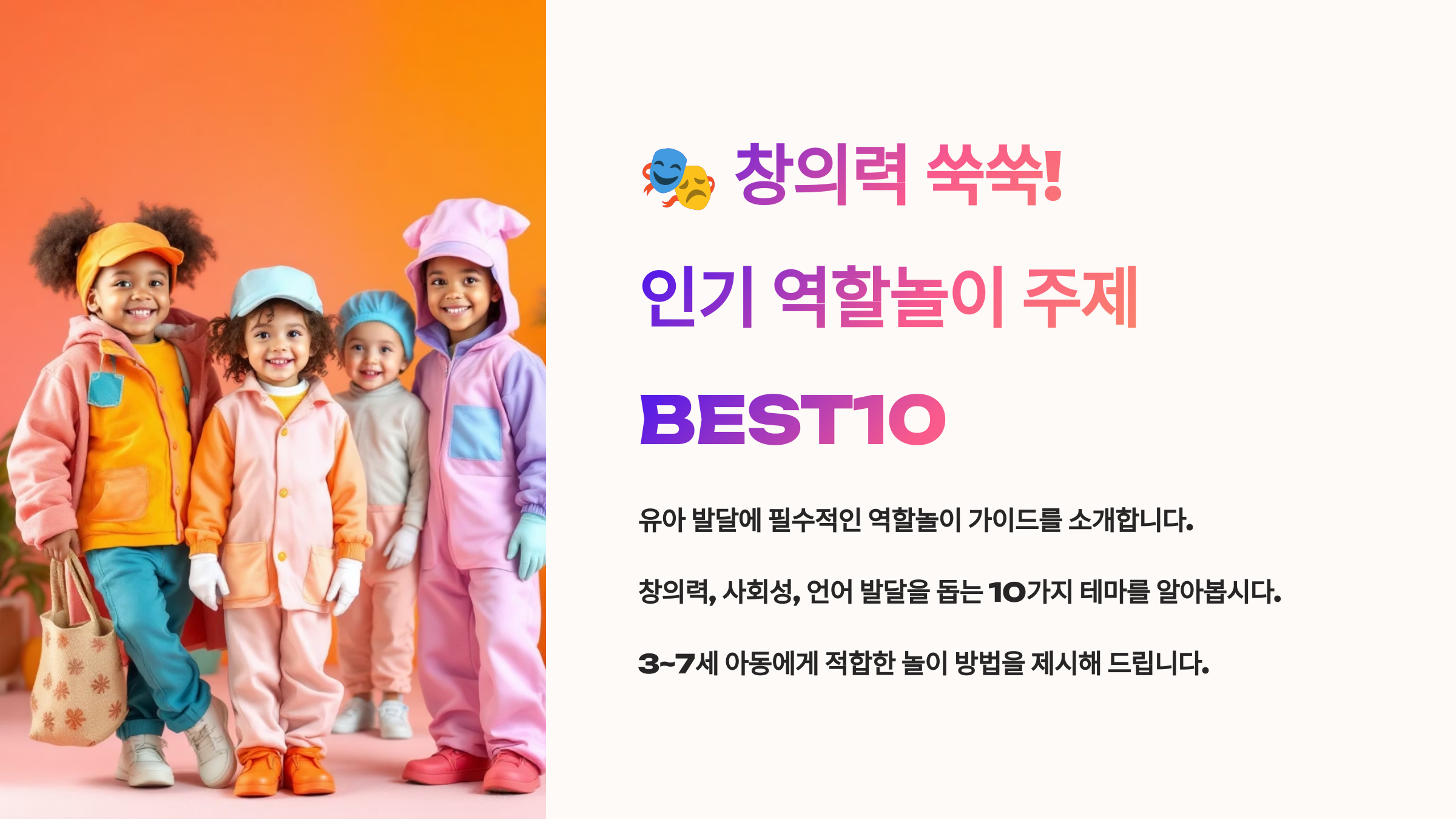 아이들은 놀이를 통해 세상을 배우고, 자신을 표현해요. 특히 역할놀이는 창의력, 언어력, 사회성을 한꺼번에 키워주는 아주 중요한 활동이에요. 상황을 상상하고, 대사를 만들고, 감정을 표현하면서 뇌는 끊임없이 자극을 받죠! 🎭🧠