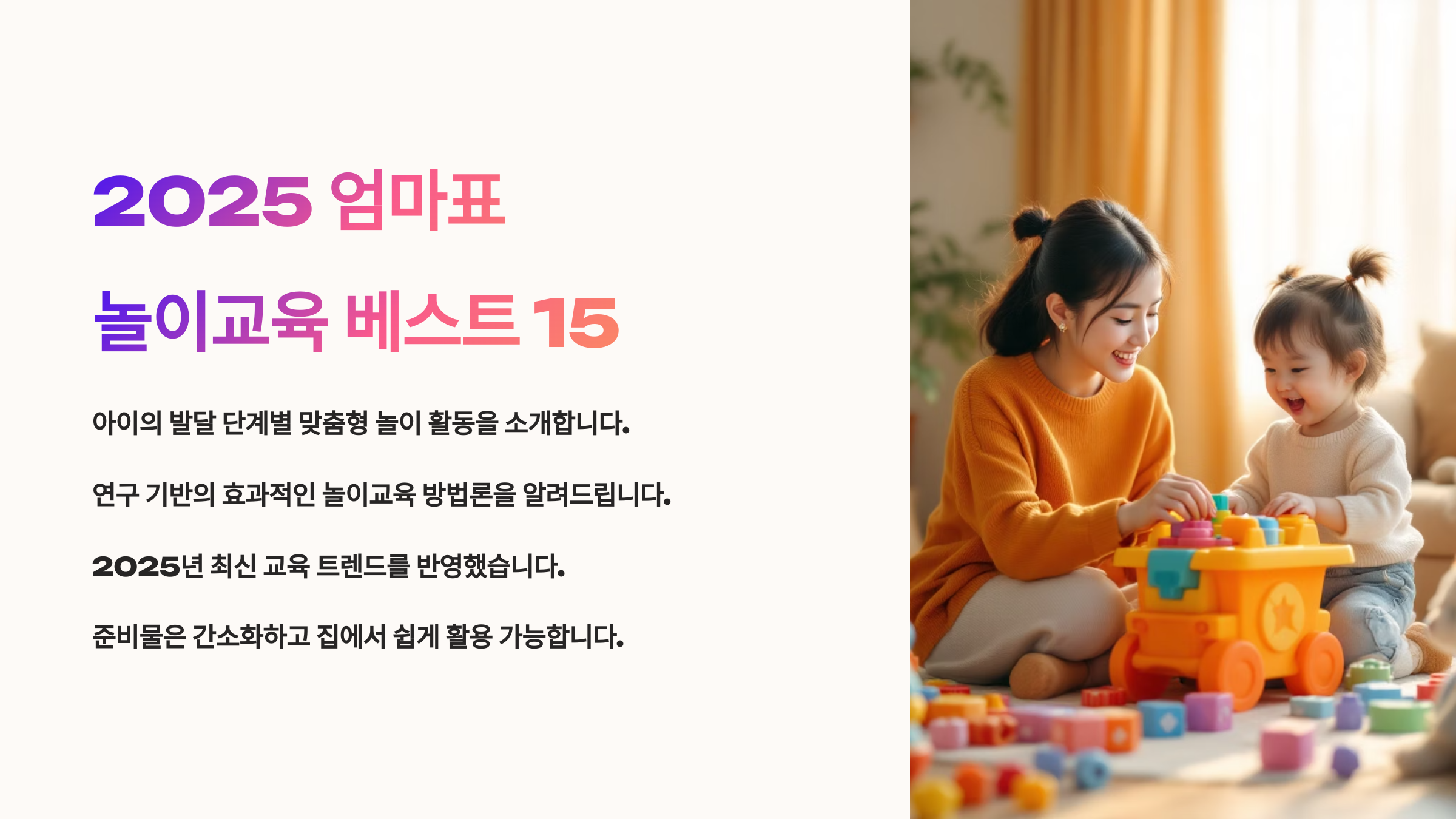 제가 생각했을 때, 아이들은 단순히 노는 것이 아니라 놀이를 통해 배우고 성장하는 존재인 것 같아요. 그래서 더욱 엄마표 놀이가 중요하다는 느낌이 들어요. 준비물도 간단하고, 집 안에서 쉽게 할 수 있어서 부담도 적고요. 이번 글에서는 실질적으로 부모님들이 많이 찾는 놀이 15가지를 카테고리별로 나눠서 총정리해드릴게요.