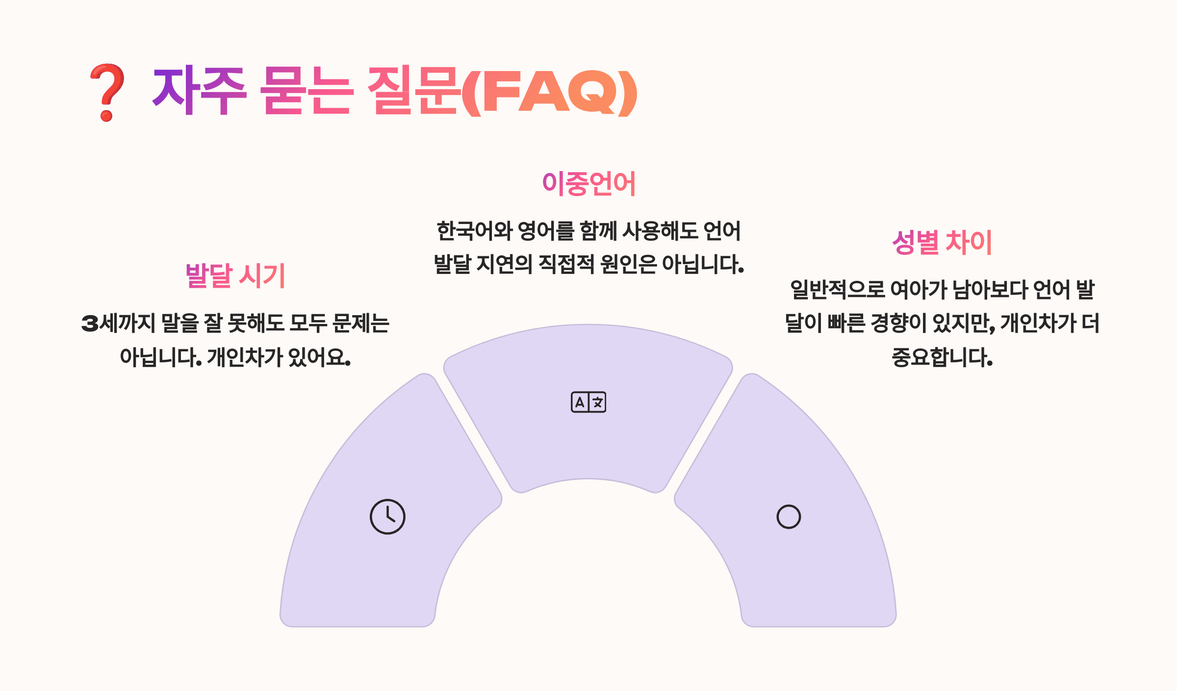 내가 생각했을 때, 언어는 사랑과 기다림 속에서 자라는 능력이에요. 비교보다는 ‘우리 아이만의 리듬’을 이해해주면서 필요할 땐 전문가의 손을 빌리는 것도 멋진 부모의 선택이랍니다 👨👩👧