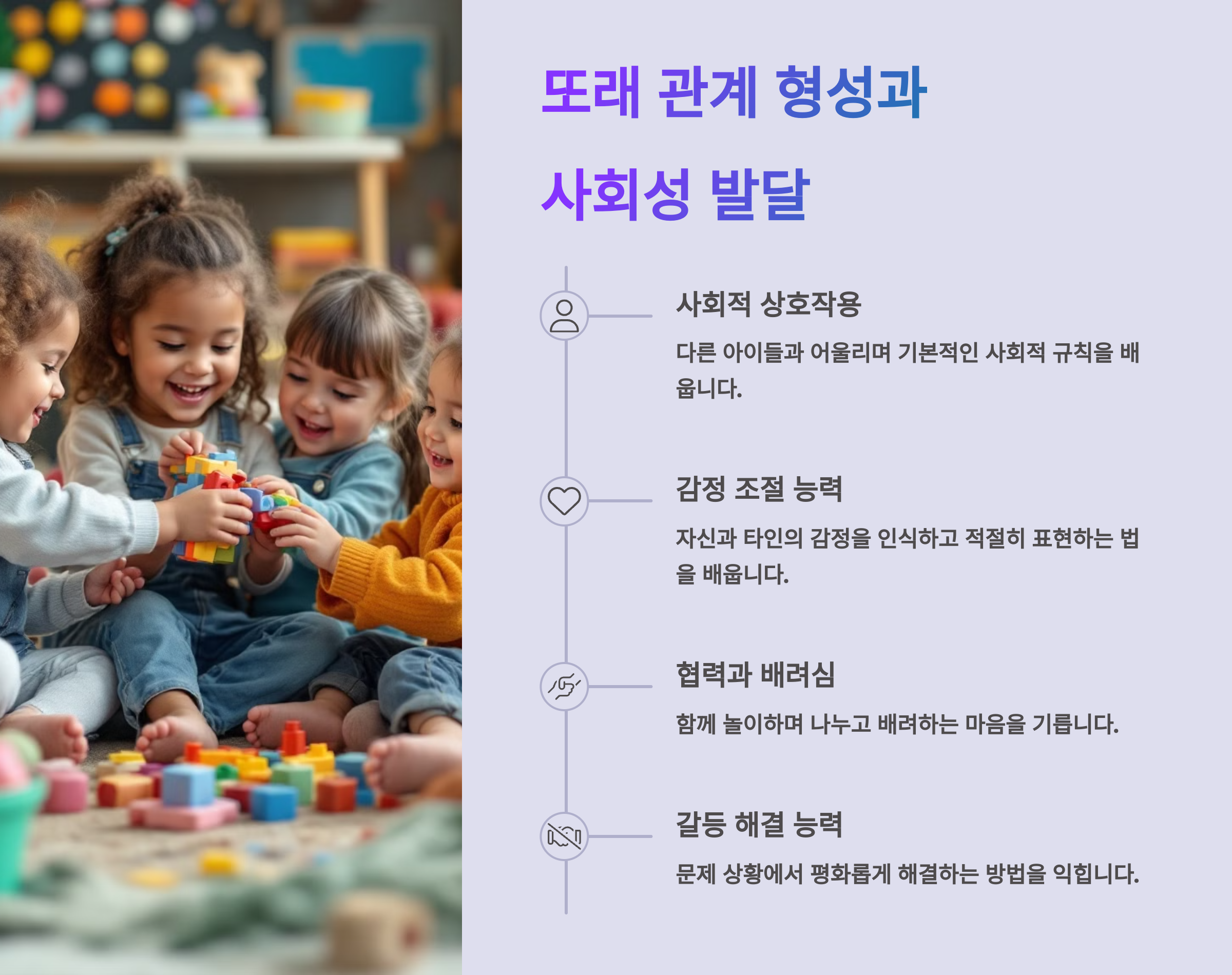 🌈 친구와 놀고 부딪치며 배우는 모든 시간은 아이의 사회적 자산이에요. 아이가 누군가와 어울릴 줄 알고, 배려할 줄 아는 사람으로 성장하는 데 유아기의 또래 경험은 절대적이에요.