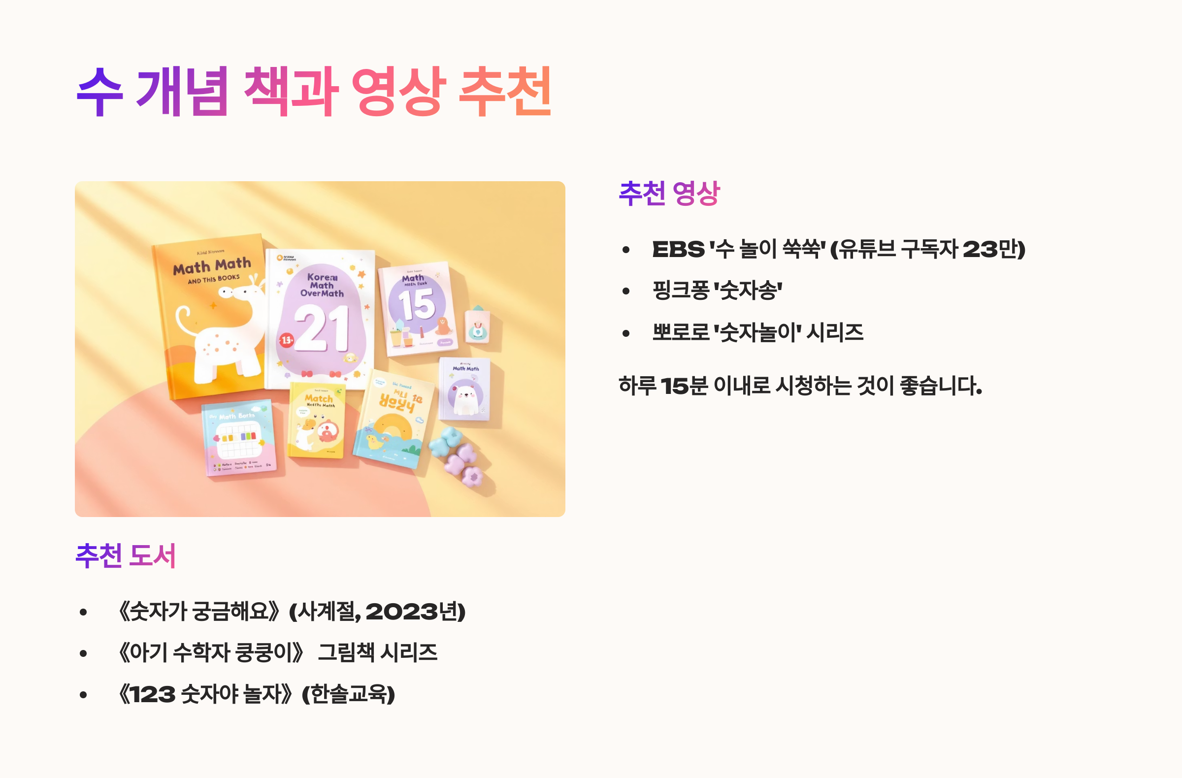 다음 섹션에서는 수 개념을 더 재미있게 만들어줄 추천 책과 영상 콘텐츠를 소개해드릴게요! 📚🎥
