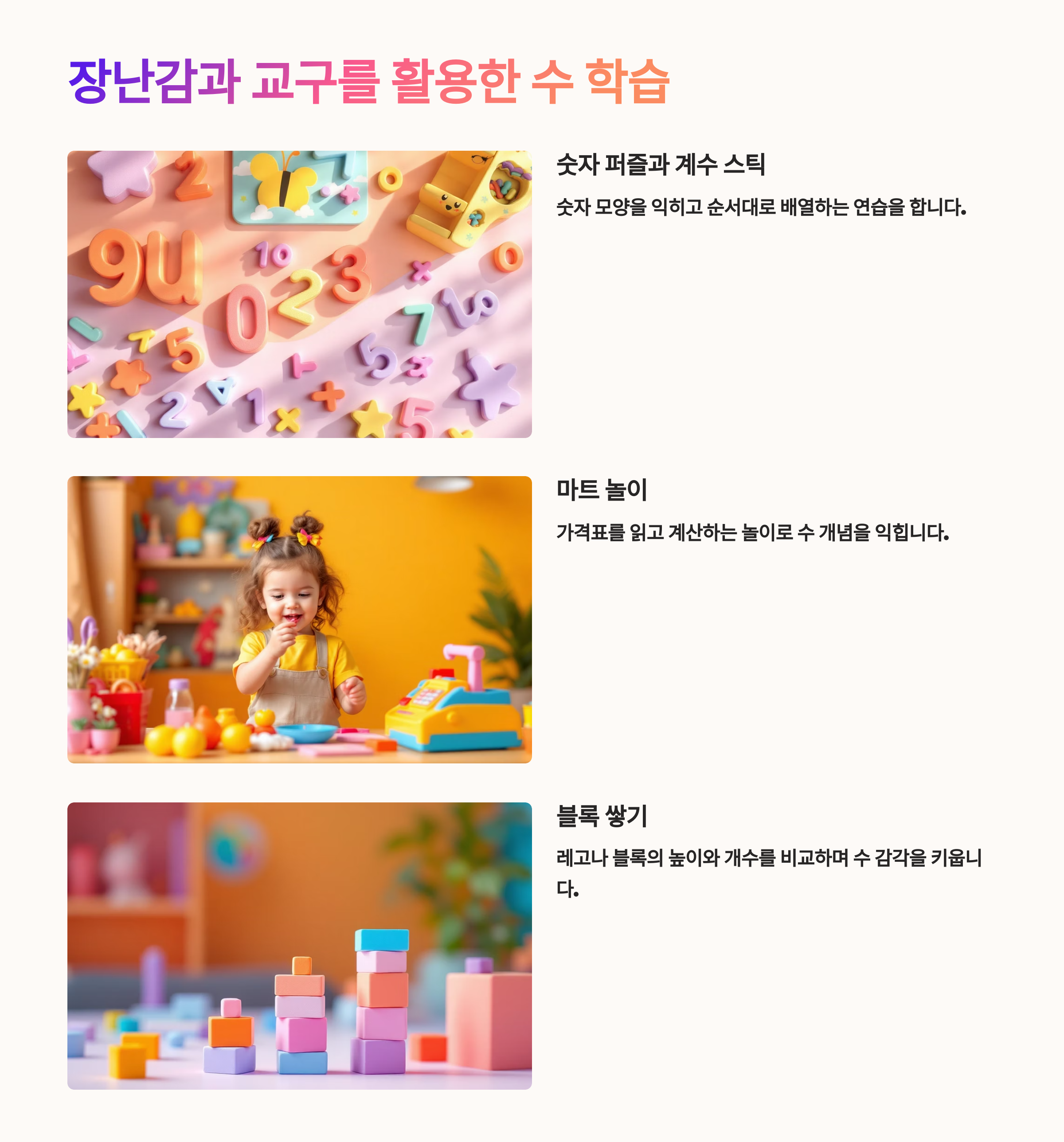 다음 섹션에서는 실제 수 학습에 도움 되는 장난감과 교구 활용법을 소개해드릴게요! 🧸📦