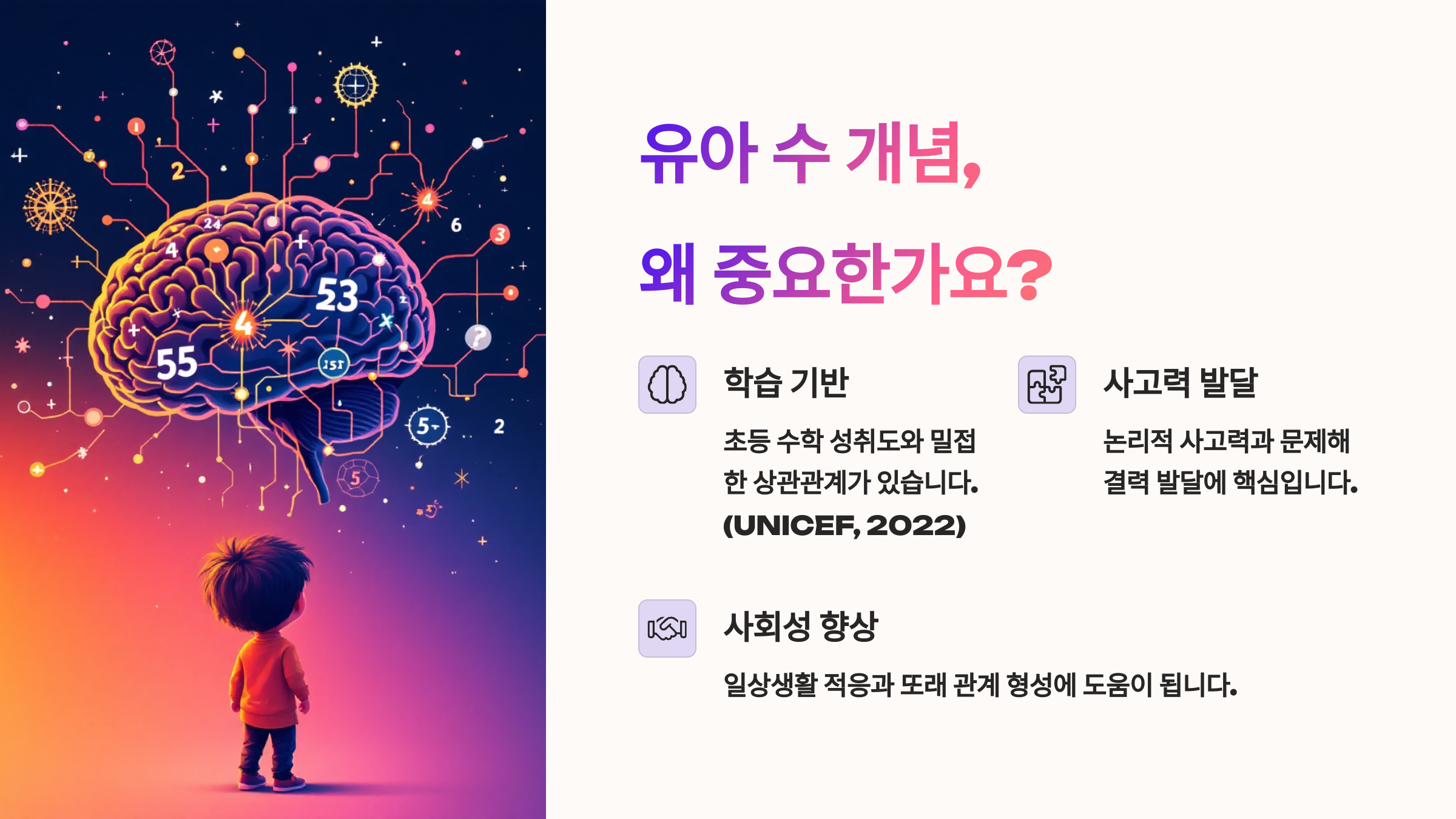 수 개념은 초등학교 입학 후 수학을 본격적으로 배우기 전에 기초 인지 능력을 다지는 중요한 토대가 돼요. 숫자를 읽고 쓰는 것 이상으로, '수'를 이해하는 경험은 논리력, 관찰력, 문제해결력으로 이어져요.