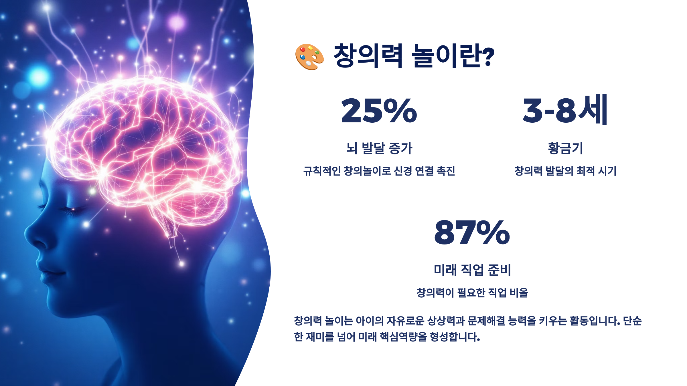창의력은 훈련을 통해 발달해요. ‘어릴 때부터’ 반복적으로 자극받은 아이가 성인이 되었을 때 새로운 아이디어를 더 잘 떠올리고, 문제 상황을 유연하게 해결할 수 있다는 연구 결과도 많아요. 그래서 지금 이 시기에 어떤 놀이를 하느냐가 정말 중요하답니다! 🧠