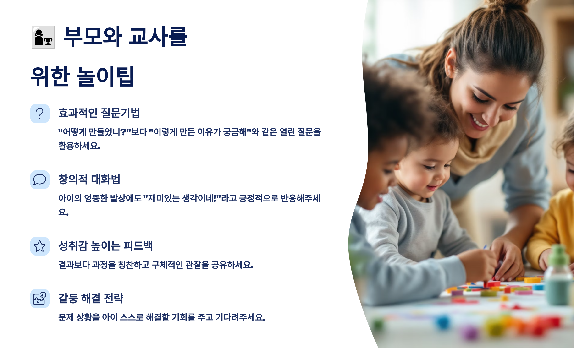 아이가 창의적으로 자라기 위해선 '좋은 놀이 환경'이 필요하고, 그 환경을 만들어주는 건 바로 어른들이에요. 부모님과 선생님이 단순히 놀이를 ‘해주기만’ 하는 게 아니라, 아이의 생각을 듣고, 함께 즐기고, 반응해주는 것이 핵심이랍니다. 🧡
