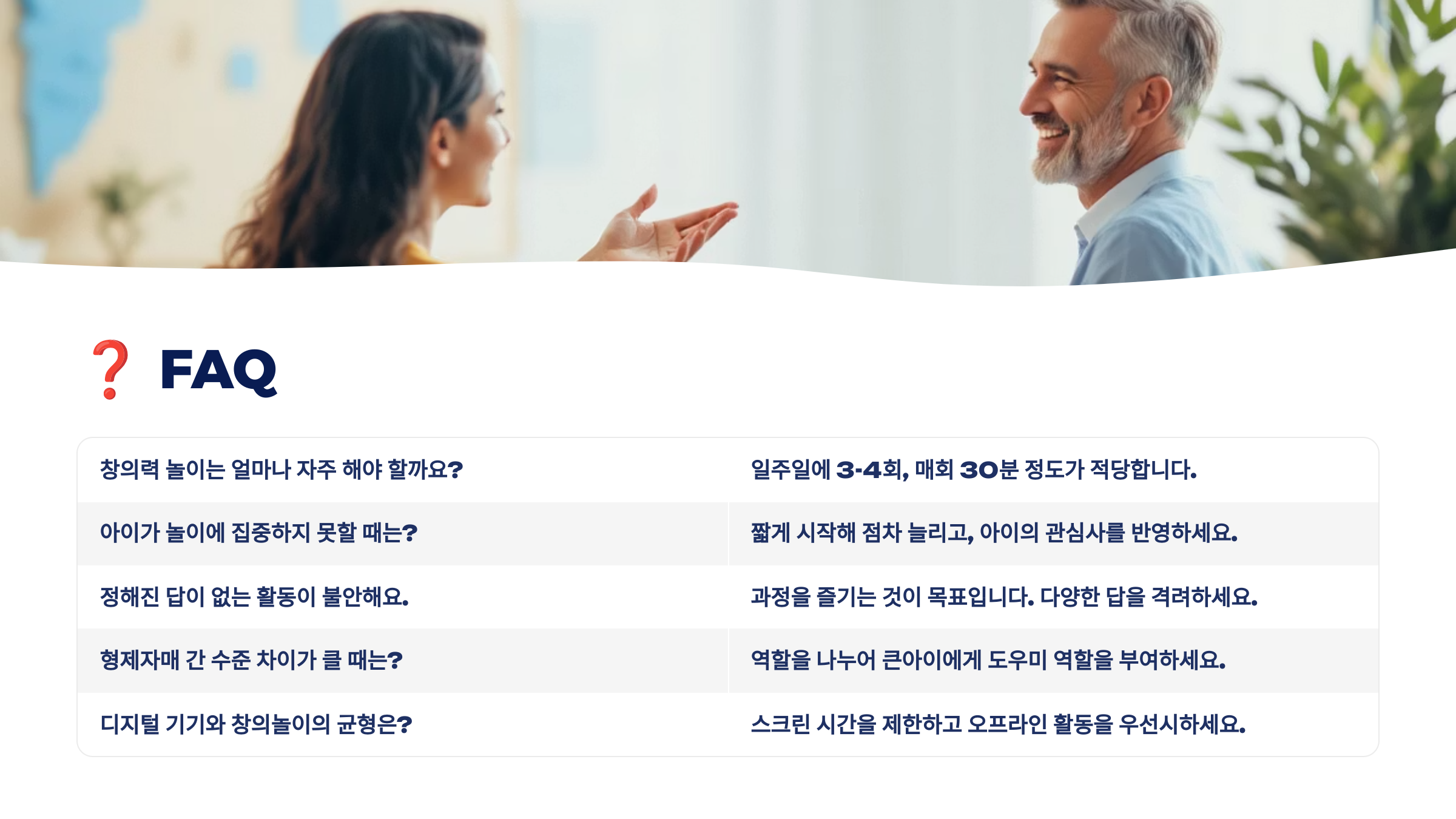 A1. 매일 하지 않아도 괜찮지만, 일주일에 2~3회만 꾸준히 해줘도 창의력 발달에 큰 도움이 돼요. 중요한 건 ‘정기적으로 즐겁게’ 하는 것이에요.