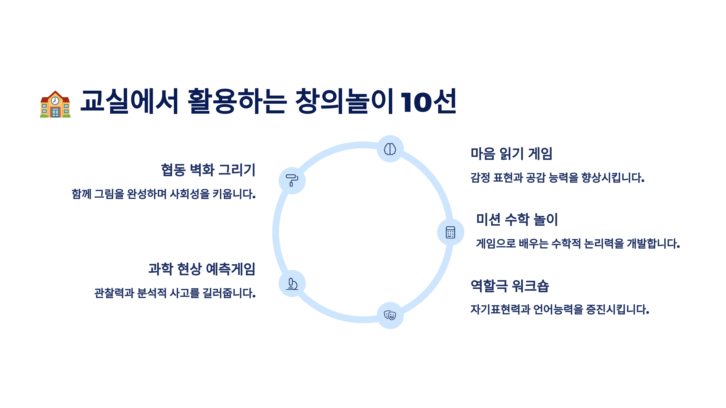 교실은 아이들이 사회성과 창의력을 동시에 키우는 최고의 공간이에요. 특히 친구들과 함께 놀고, 발표하고, 협력하는 활동은 아이의 사고 영역을 크게 확장시켜줘요. 지금 소개하는 10가지 놀이는 초등학교 수업 도입부, 쉬는 시간, 방과후 활동 등 어디에서나 활용 가능하답니다! 📚