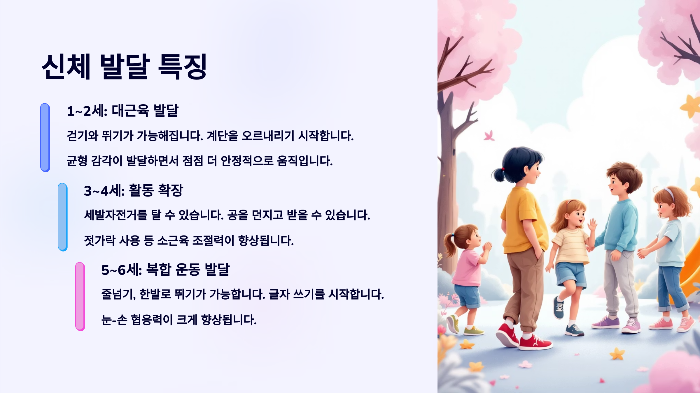🚼 유아기의 신체 발달은 '기적'에 가깝다고 할 만큼 빠르게 변화해요. 태어나서 누워만 있던 아기가 몇 년 사이에 걷고 뛰고 심지어 공까지 찰 수 있게 되죠! 이 시기의 운동 능력, 감각 조절, 체력 향상은 평생 건강한 몸의 기초가 되기 때문에 정말 중요해요.