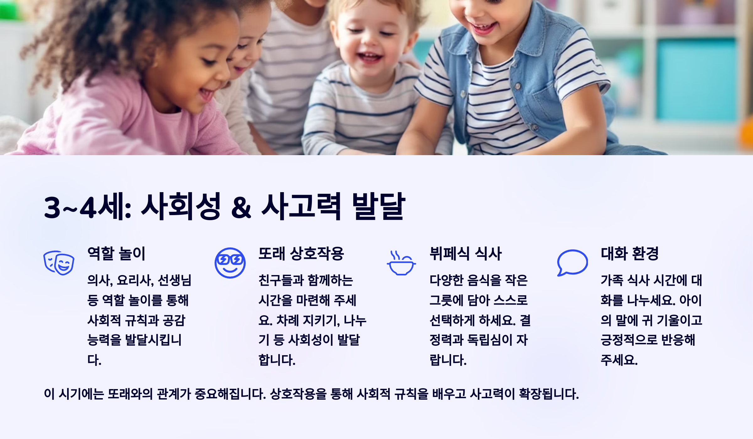 3~4세는 ‘나’에서 ‘우리’로 넘어가는 첫 걸음이에요. 함께하는 놀이, 대화, 감정 교류가 아이의 사회적 뇌를 활짝 열어준다는 걸 기억해 주세요! 🤝