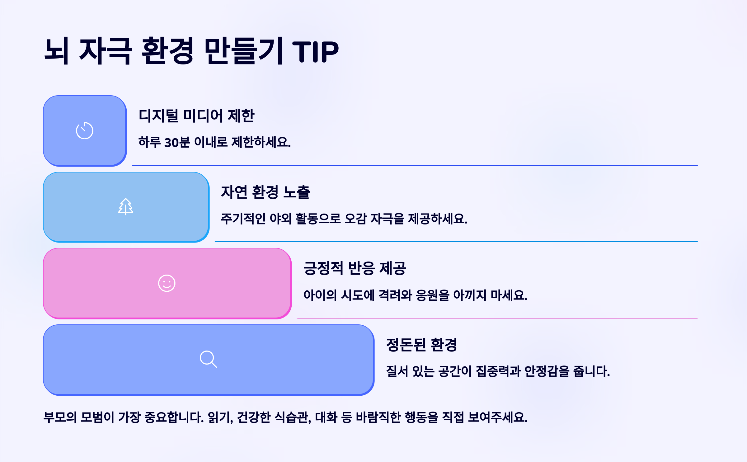 유아의 뇌는 주변 환경에 따라 놀라운 속도로 반응하고 변화해요. 그렇기 때문에 집 안의 자극 환경을 어떻게 구성하느냐는 뇌 발달에 직접적인 영향을 줘요. 공간을 완전히 새로 바꾸는 게 아니라, 아이가 자율적이고 창의적으로 놀 수 있게 ‘설계’해주는 것이 핵심이에요.